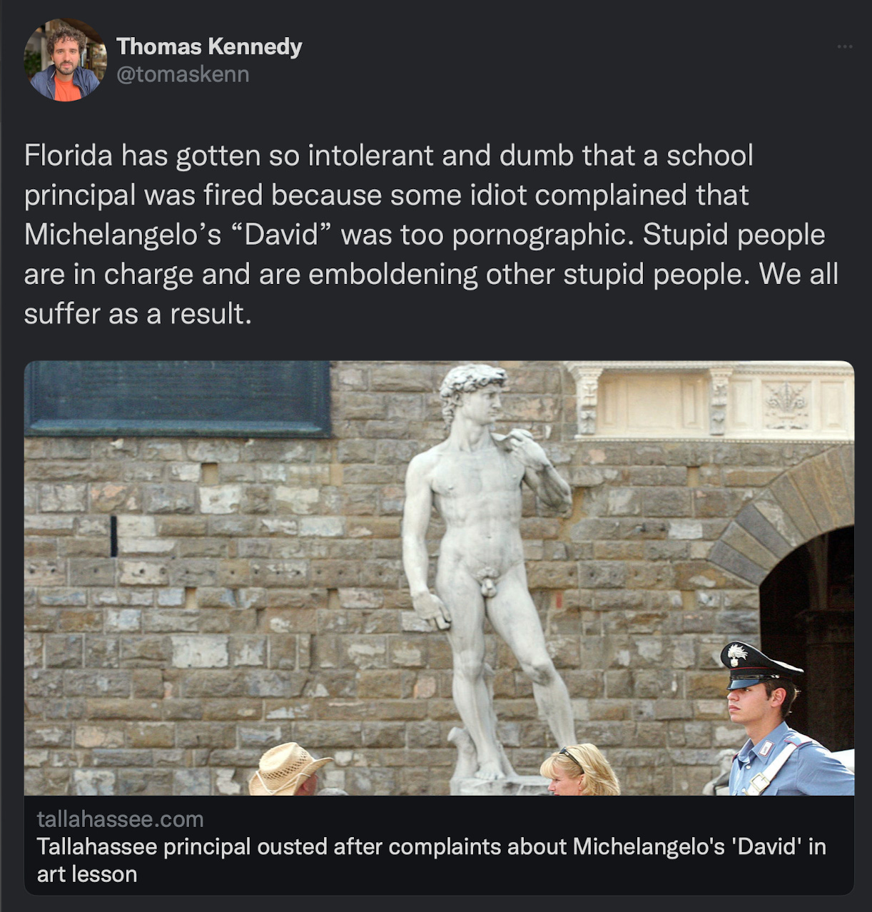 And so now this force in America, this movement, appears to have refocused. Not just on top-down approaches, but on bottom-up ones, too, working hand in hand. Take DeSantis, for example. His approach is to encourage fanatics to empower school boards — for which he then rewrites the rules. The school boards are given leeway and latitude to decide what’s against the rules and what’s not. This is classic example of bottom-up authoritarianism brewing. Now, fanatics who’ve packed said boards can go out and do things that make the world gawp in astonishment, like firing school principals for teaching kids about…artistic masterpieces. Because of course now that DeSantis, the Governor, has said that “groomers” are at work, and schools must be cleansed of any “wokeness” and so forth, well, that’s not a statue of David by Michelangelo, that’s a groomer. LOL.