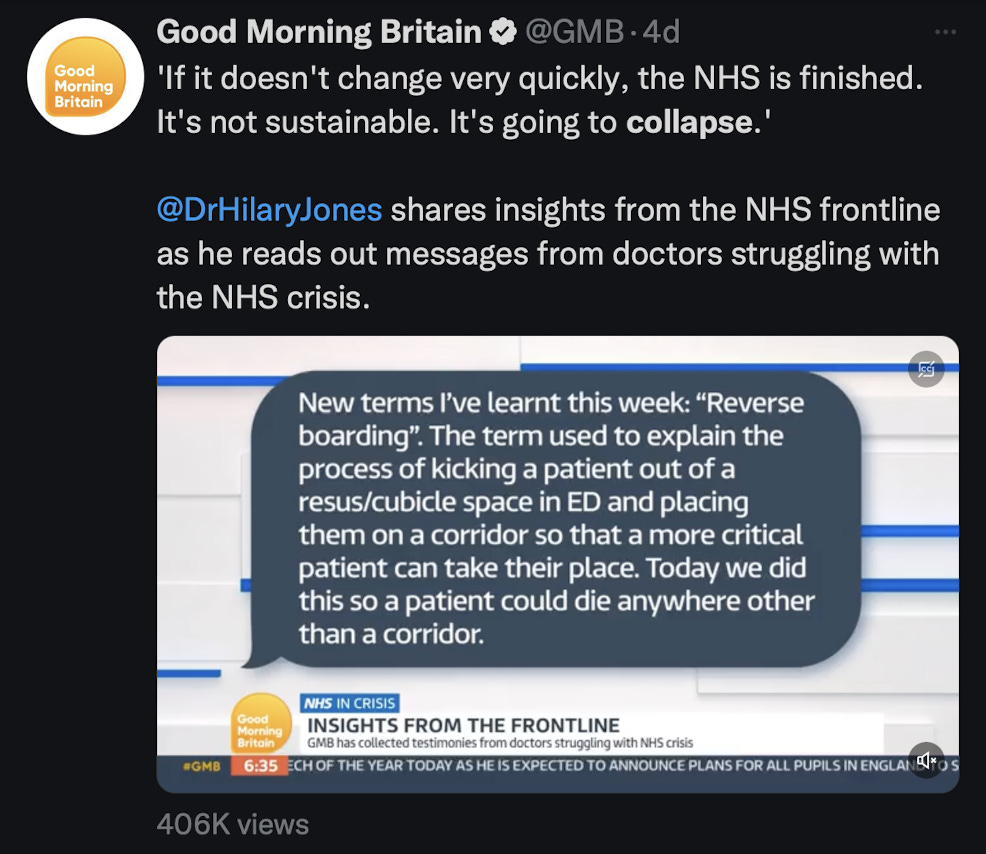 And yes, people are dying. It was just last week that the head of the Royal College of Emergency Medicine estimated that up to 500 people a week are dying because they can’t get emergency care. 500 people a week? Adjusted for population, for a country Britain’s size, that’s a 9/11…every single week. We are talking that level of catastrophe.