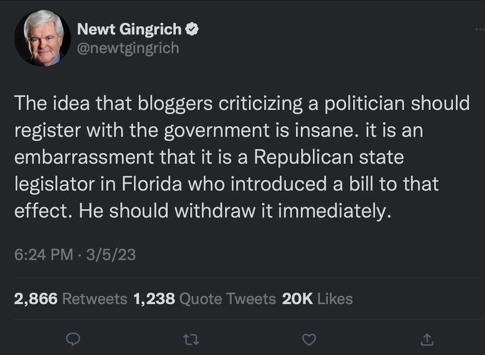 Luke. Luke! I am your… it was, in one of those great, absurd, funny ironies of history, New Gingrich who said it was finally going too far. Reacting to the new bill in Florida to make…bloggers…register with the state…so as not to criticize Ron DeFascist…Newt said: “The idea that bloggers criticising a politician should register with the government is insane…It is an embarrassment that it is a Republican state legislator in Florida who introduced a bill to that effect. He should withdraw it immediately.”