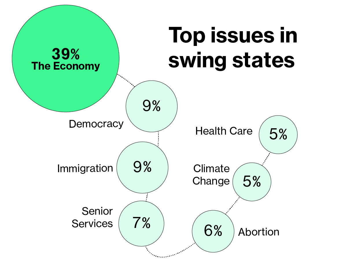 The respondents — from Arizona, Georgia, Michigan, Nevada, North Carolina, Pennsylvania and Wisconsin — selected the economy as the most important issue heading into the next presidential election. Eighty-three percent said the issue was “very important,” and 13 percent said it was “somewhat important.”