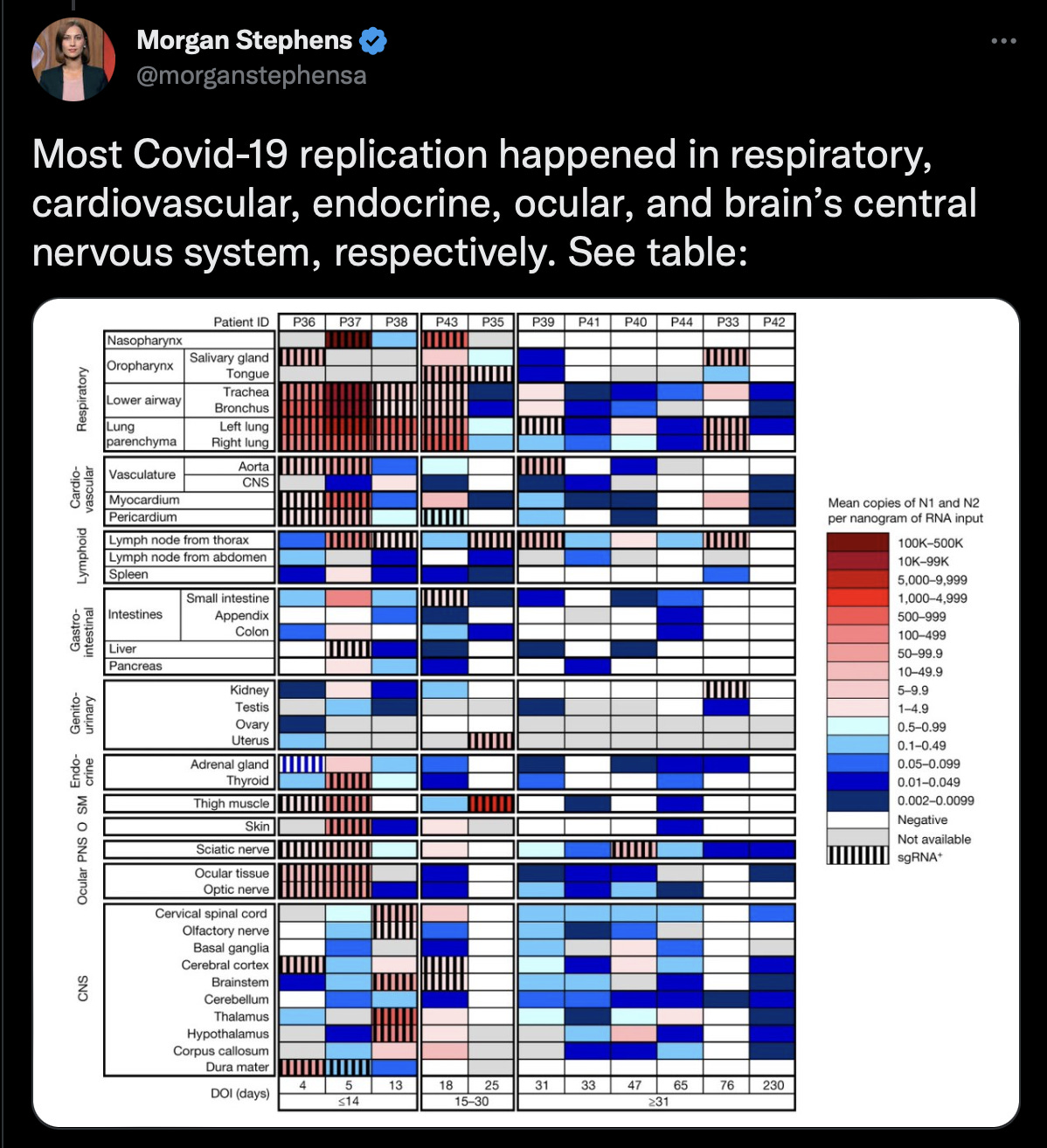 Others have previously reported SARS-CoV-2 RNA within the heart, lymph node, small intestine and adrenal gland. We replicate these findings and conclusively demonstrate that SARS-CoV-2 is capable of infecting and replicating within these and many other tissues, including brain…. [these] prove definitively that SARS-CoV-2 is capable of infecting and replicating within the human brain.