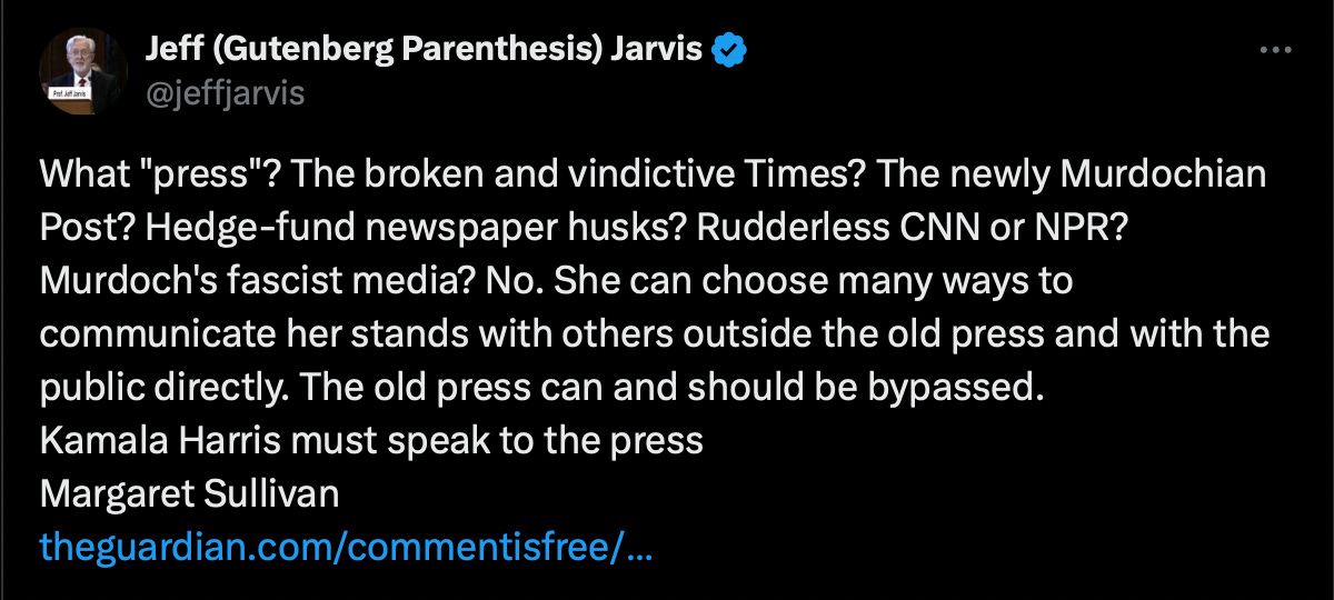 Kamala’s right not to speak much to this media. Not just for political reasons, but for institutional ones. Sure, it’s a smart media strategy not to talk to those who won’t give you a fair shake. But in institutional terms? Media needs to be reminded what its job is. And to do that, it needs a comeuppance, in the form of being reminded: it’s not the ultimate arbiter of legitimacy.