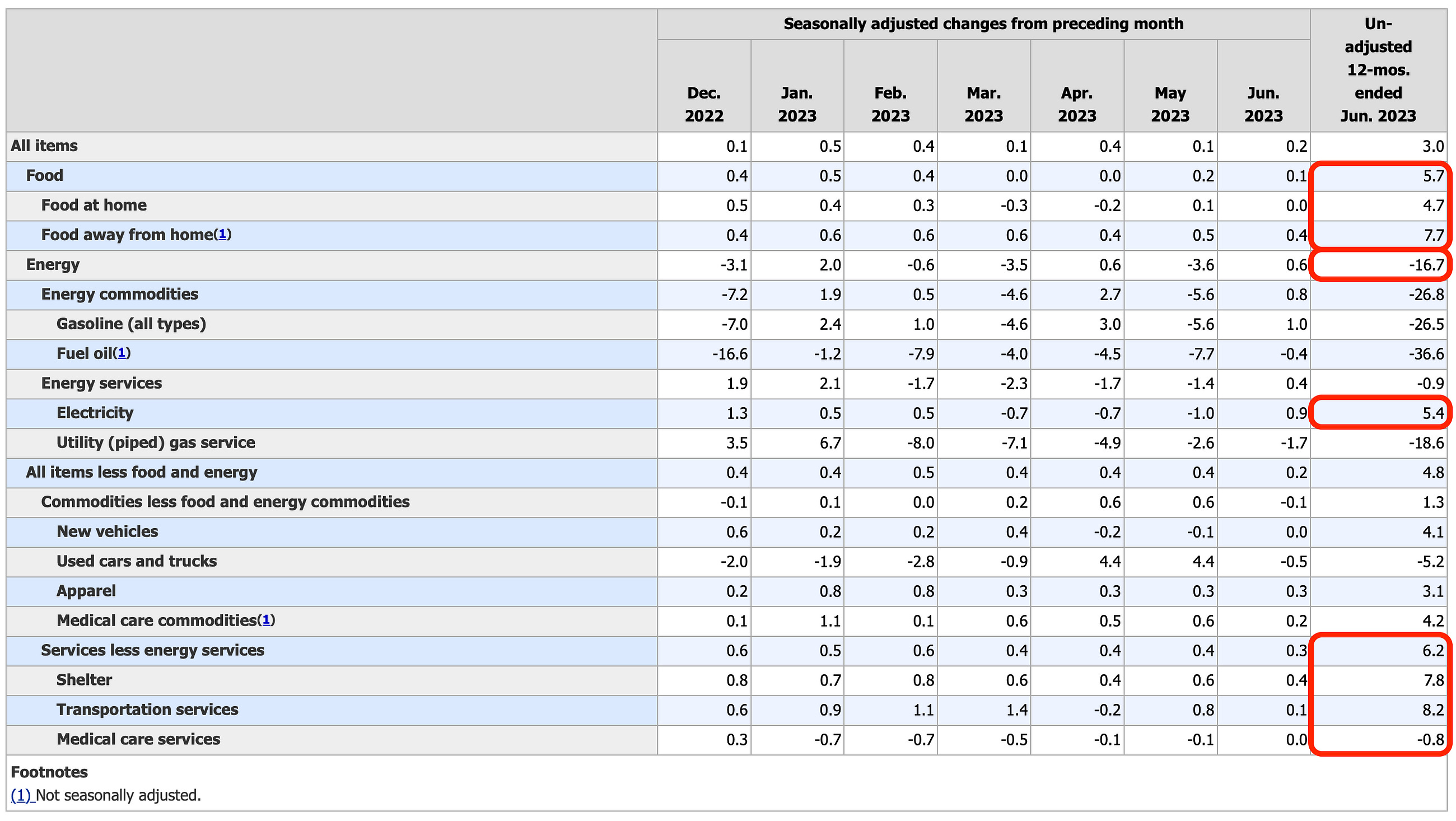 We could begin at the top, with food. The most basic…basic…of all. What does the chart say? Food inflation is still at 6%. “Food at home” — meaning stuff that you buy at the grocery store, bread, milk, cheese, meat, eggs — is hitting about a 5% inflation rate. “Food away from home” — that’s eating out, whether you sit down at a nice restaurant, or order in, or even pick up a takeaway — is inflating at about 8%.