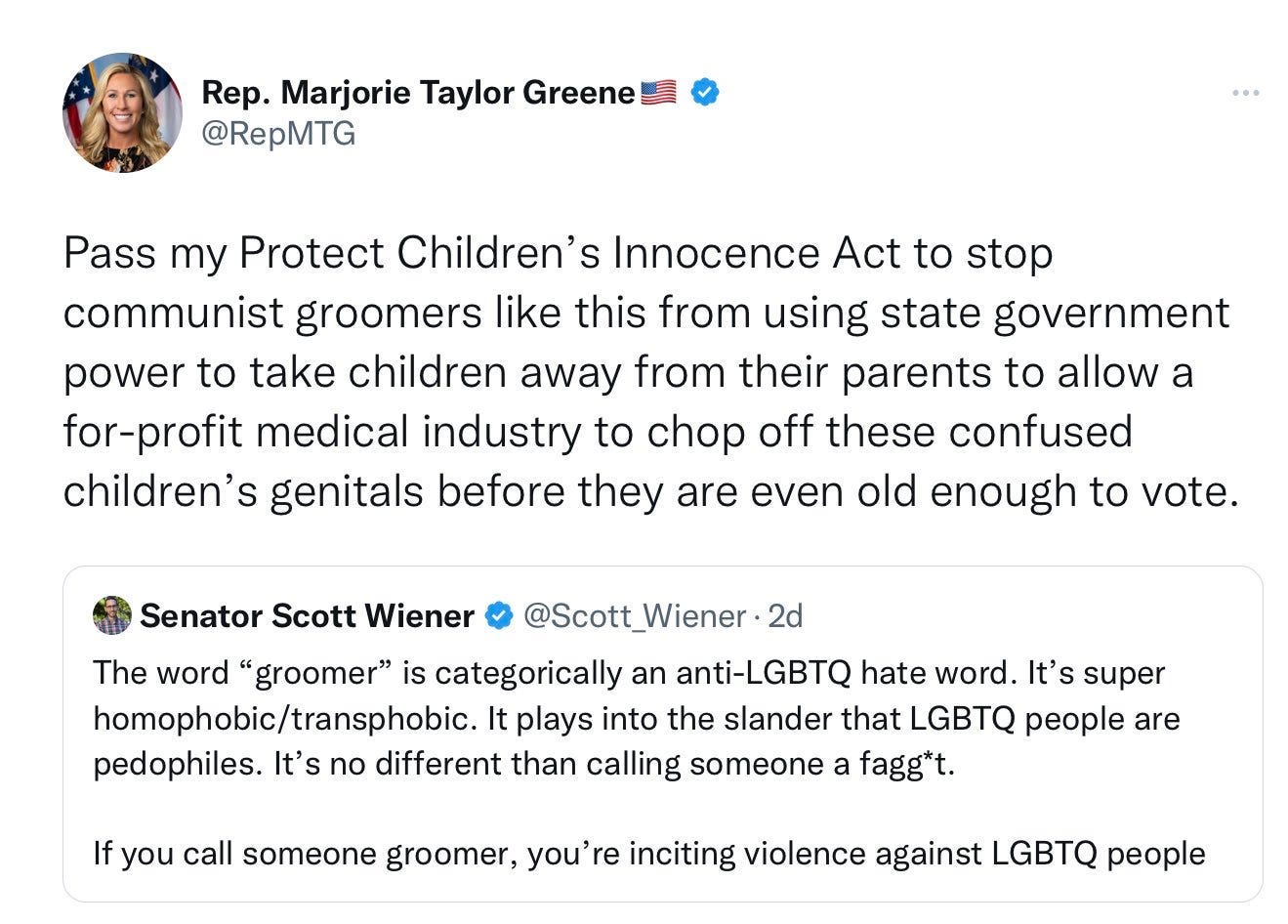 Think of how crazy all this really is. That all this is now normal. Not just saying that whole social groups — teachers, the LGBTQ, whomever — are groomers and pedophiles, as if that wouldn’t be odious enough, but actually meaning it. Because behind this, like I said, lies a convoluted set of conspiracy theories. Basically, they all add up to a paranoid form of racial genocide — you’re trying to get our kids, turn them gay, make them trans! As if anyone chooses to be. So that…so that…we don’t have a master race anymore!!