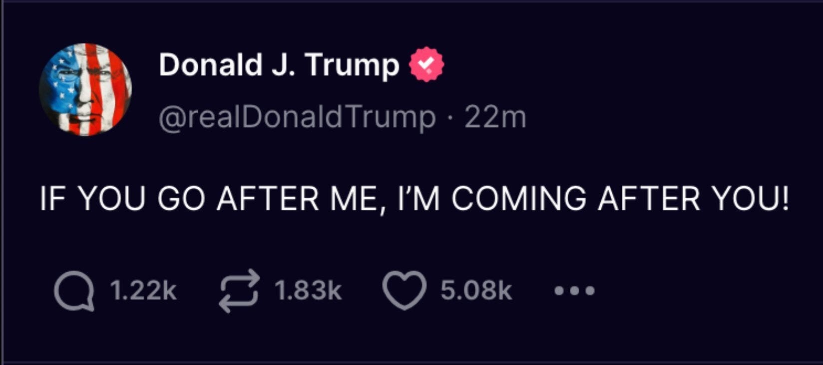 By now, you’ve seen the tweet above (can we still call them tweets?) That’s Donald Trump, saying that he’ll “be coming for” anyone who “goes after” him. In response, Jack, the Special Counsel prosecuting him, took out a protective order. And of course the internet lit up in outrage — many said that this was a clear violation of Trump’s terms of release, which include not…trying to intimidate witnesses and prosecutors.