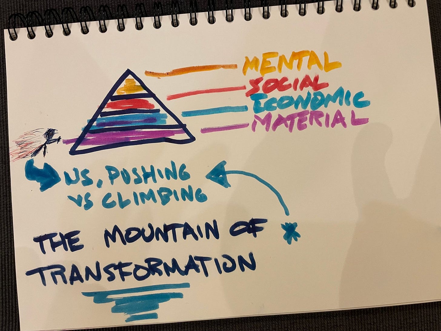 One of the ways I've been thinking about it these days is through a lens: what I've come to think as the Mountain of Civilizational Transformation ahead of us. I think it's a powerful model with which to begin understanding where we really are. The "narrowing window" in which to climb that mountain. What it means, even, really to climb it, as organizations, whether civilizations, companies, cities, countries, or just as people.