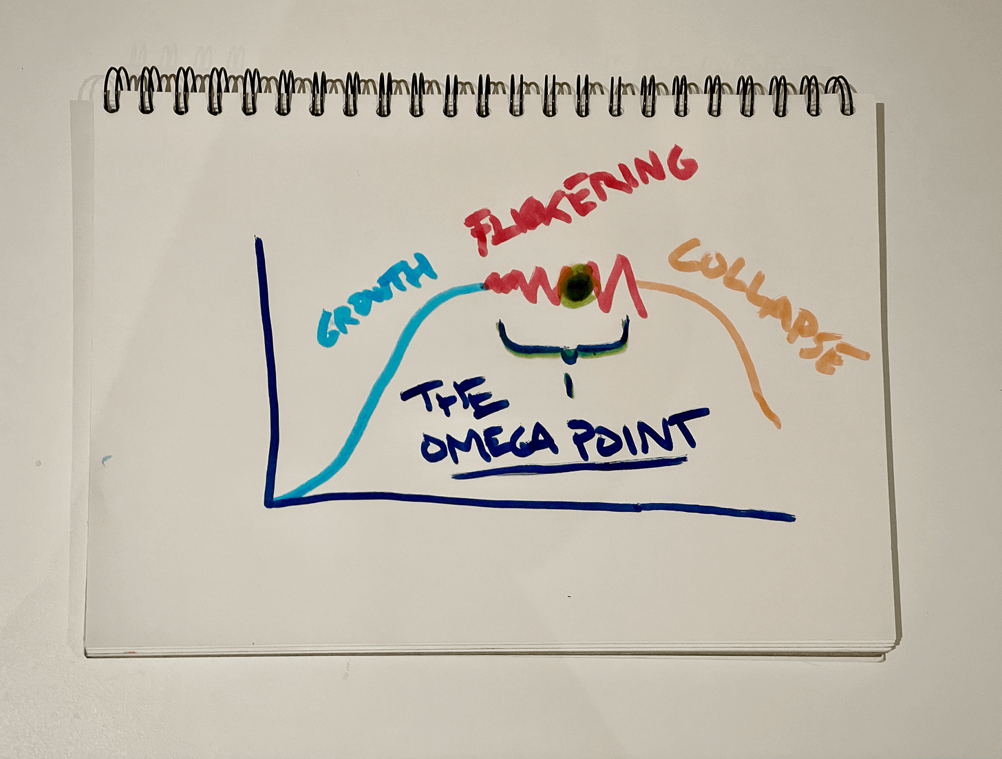 I think we badly need to understand this, and I’ve sketched out a little theory for you so far. Normality. Things plug along. Nobody much worries. Troubles emerge. They grow. And almost invisibly, the Omega Point is reached—and collapse is baked in. I’ve tried to draw that for you in the chart above.