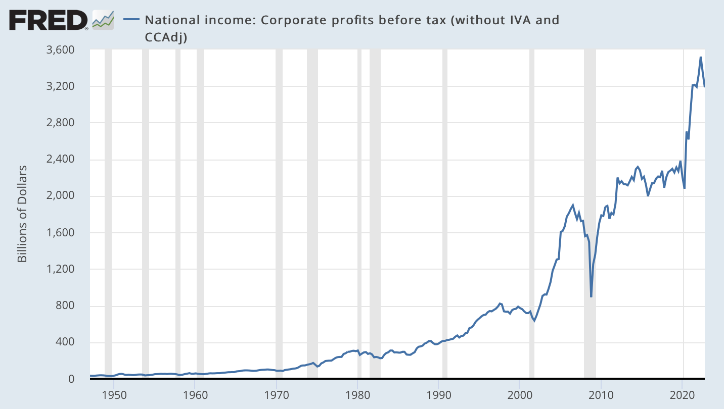 During Covid, corporate profits leapt upwards by as much or more as the dot com boom. LOL. You should be able to see what’s wrong with this picture. The dot com boom was a classic story of technological progress. Covid was a pandemic. Big difference. Profits rising because of technology and efficiencies — debatable, at least. But profits soaring that much, again, during a pandemic? That, my friends, is pretty obviously profiteering.