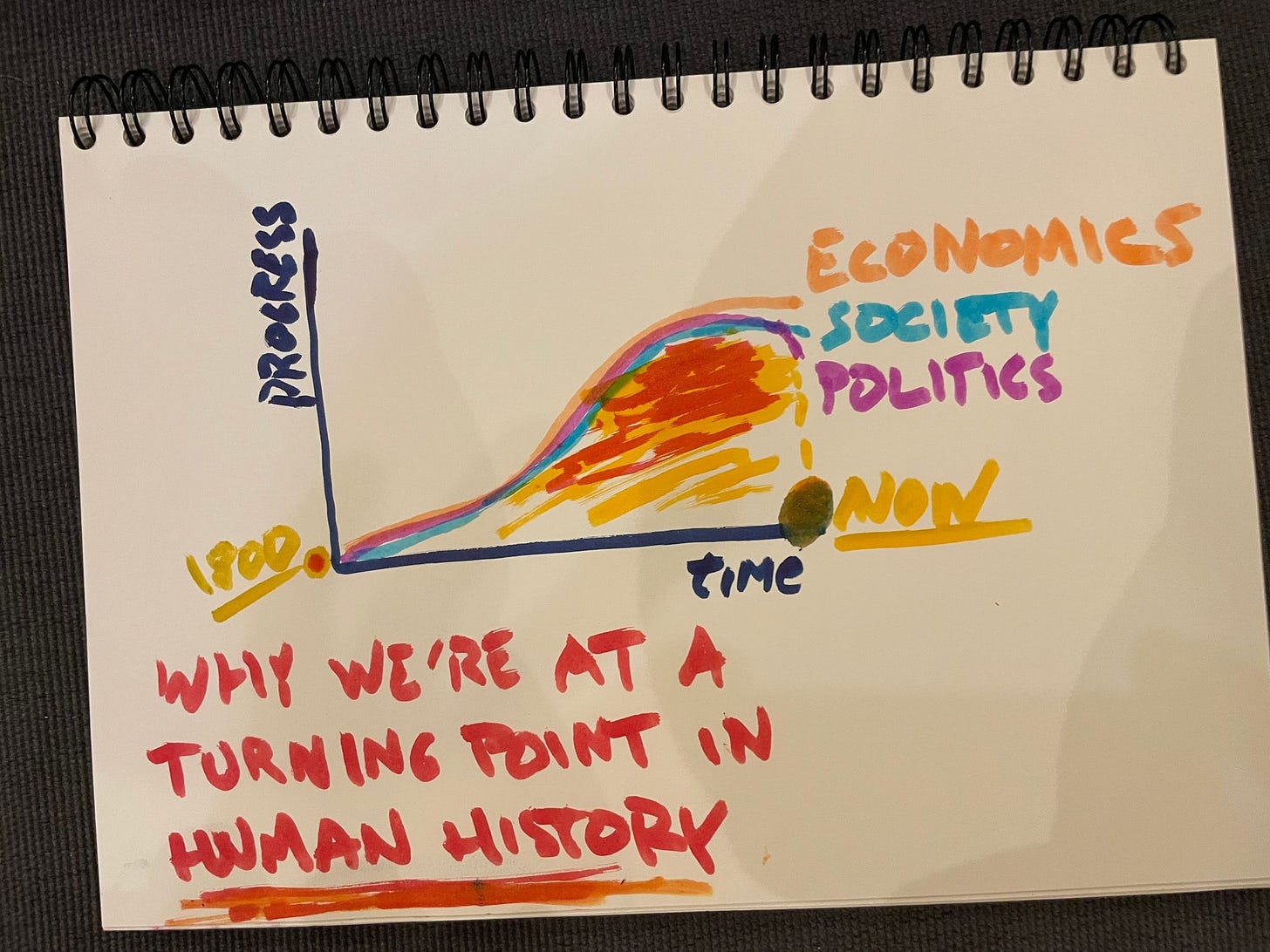 Ever. I said it thrice so that you understand how incredibly portentous this development is. What was human development? It was an exponential line, from a flat base. The base lasted tens of millennia, and in recent history, over the last few centuries, development and progress exploded. And now that appears to be peaking. All that. A trend that reaches through the entirety of the human journey itself. What could be more important than that? More historic?