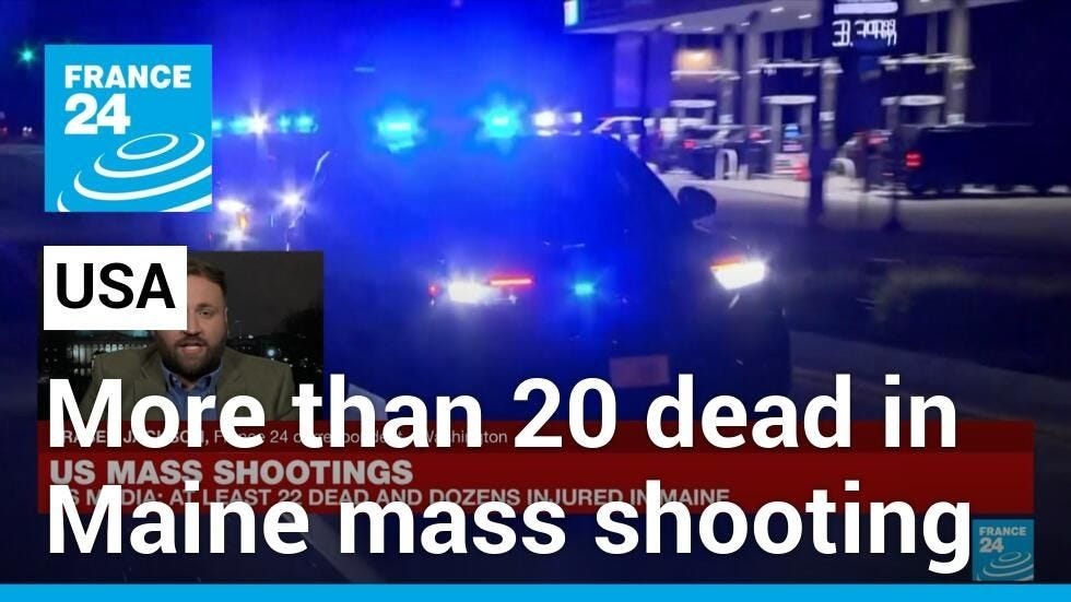 I went to the park this morning with Snowy, my little funny dog. And there, my European friends told me about it, aghast. I hadn’t read the headlines yet. A massacre in Maine. A lunatic with an “assault rifle.” Double digits dead. Towns under lockdown. Horrific tragedy.