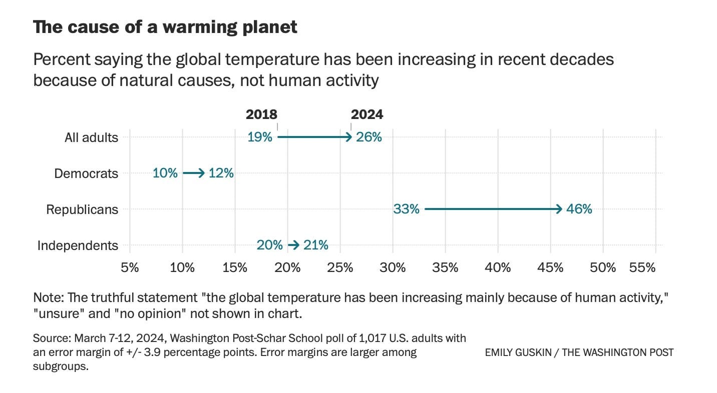 Meanwhile, the average person is less and less likely to believe that this is real, aka, there’s such a thing as human-made climate change. In the last few years alone, the number’s grown significantly, and over a quarter now believe that climate change is due to “natural causes, up from just 14%. That’s not an absolutely high number in itself, but the trend is striking, disturbing, and sort of mega-troubling: increasing numbers of people are climate deniers.