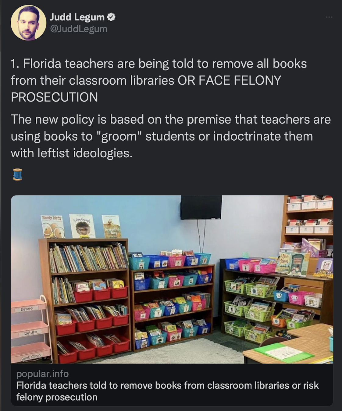 How bad is it? Just how dystopian are we talking? As the journalist Judd Legum pointed out, “Teachers in Manatee County have been told to remove all books from their classroom libraries. On Monday, for example, teachers at Bayshore High School in Manatee County received the following message: ‘Remove or cover all classroom libraries until all materials can be reviewed.’”