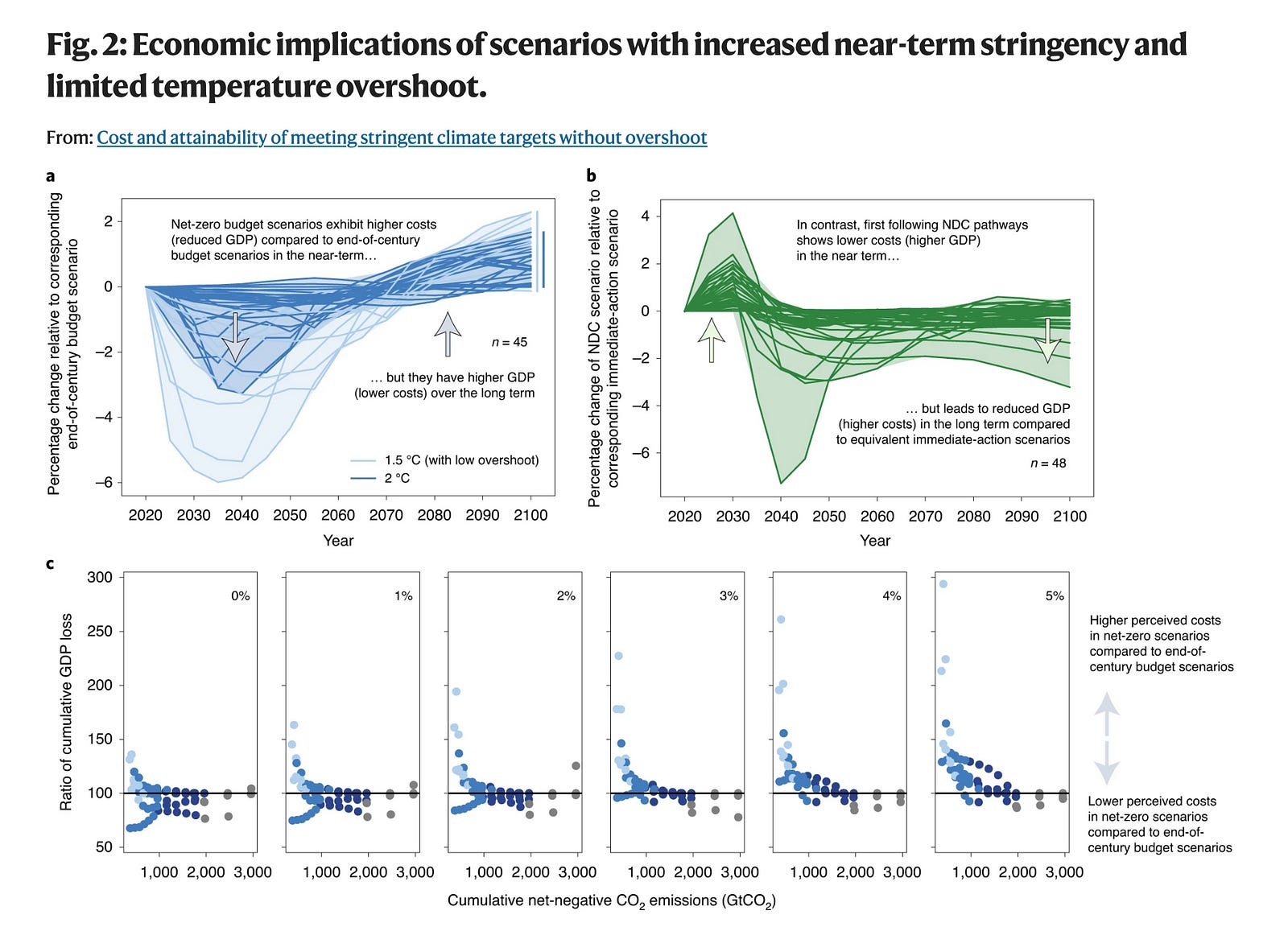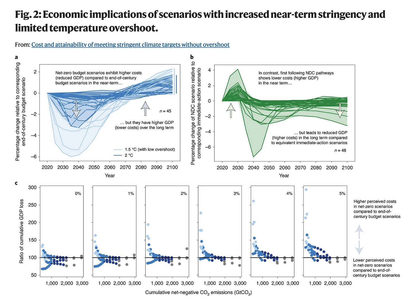 Take a hard look at the chart above. It’s cutting edge research, some of the best I’ve seen. I know it’s complicated, so I’m going to explain it. It shows us, more or less, the change in GDP over time, in two cases, for one scenario. I know, I know, bear with me. The scenario here is “overshoot” — that means temperatures rise, and then they come down, because, well, we did something about climate change. That’s the good scenario — because temperatures come down. In this scenario, there are two cases — one, we get serious, aim for “net zero” (don’t worry about that, just see the point) and that has costs now, but helps later. In the other, we don’t do nearly as much, and that doesn’t have so many costs now, but does later.