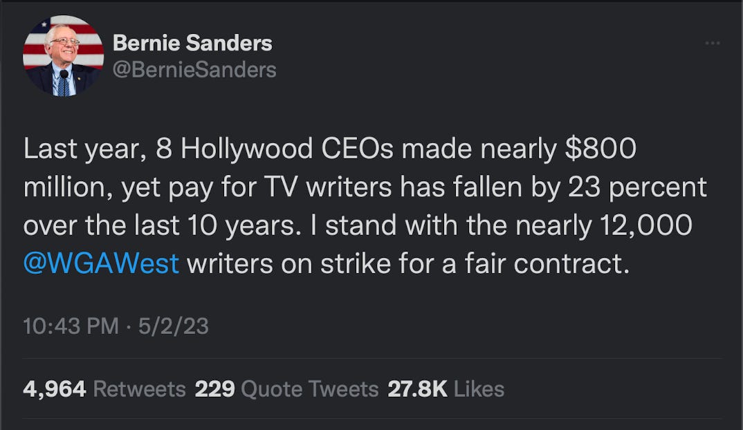 Leave it to Bernie Sanders to sum it up best. “Last year, 8 Hollywood CEOs made nearly $800 million, yet pay for TV writers has fallen by 23 percent over the last 10 years.” Ouch. That’s a concise description of the reason more than 11,000 writers are now on strike. And in America? That’s a big deal, because the Writers’ Guild is one of the few labour organizations which still functions. You don’t see a strike at this scale often, even in Europe — but especially not in America.