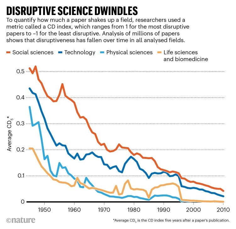 Now, this is a subtle and maybe strange idea, so let me put it to you a different way. See the chart above? It means exactlywhat the title says: disruptive science is steadily declining. The kind that yields grand breakthroughs, new paradigms, shatters old preconceptions.