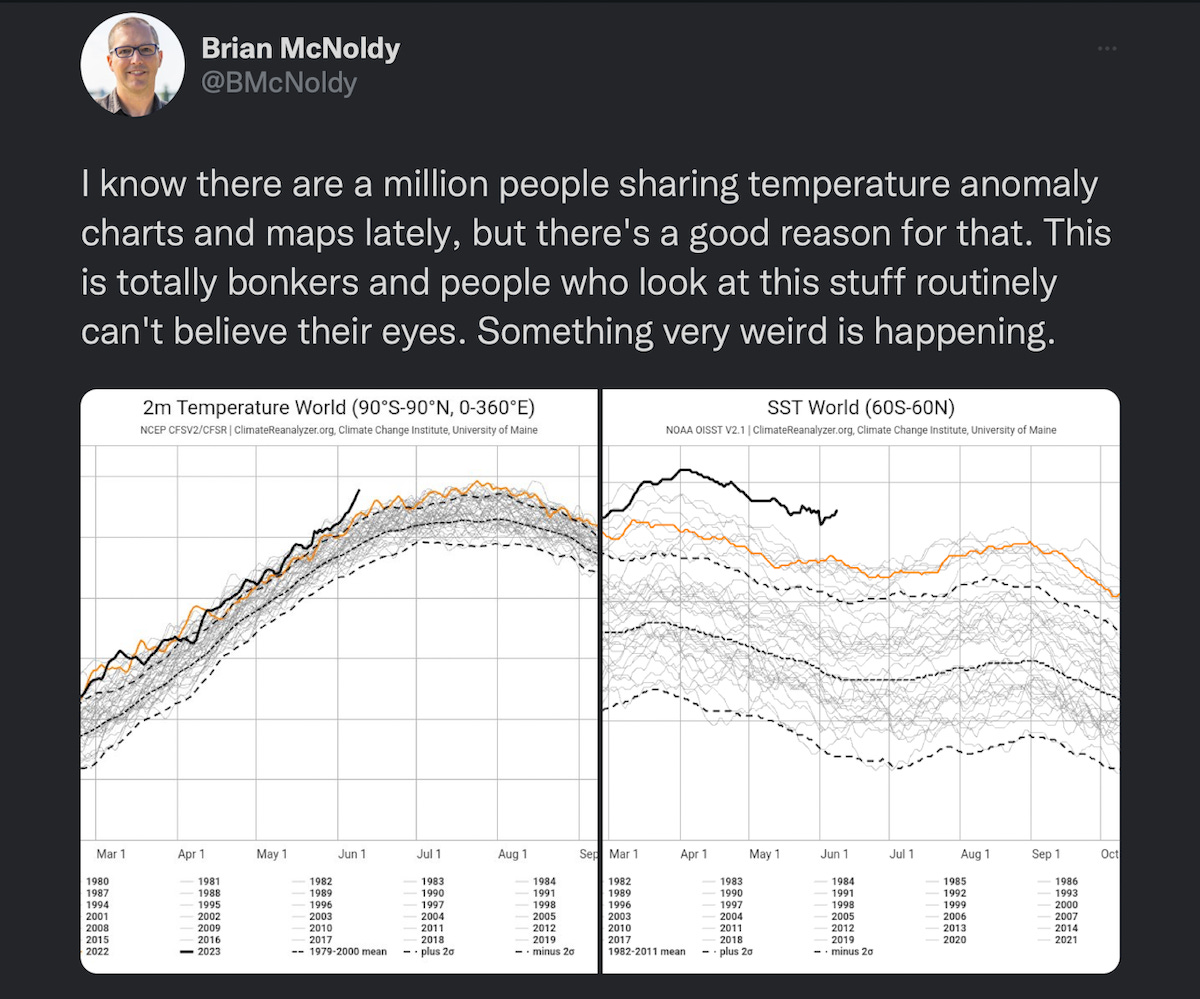 In a widely shared tweet, Brian McNoldy, senior research associate at the University of Miami Rosenstiel School of Marine, Atmospheric and Earth Science, called rising ocean and air temperatures “totally bonkers.” He added, “people who look at this stuff routinely can’t believe their eyes. Something very weird is happening.