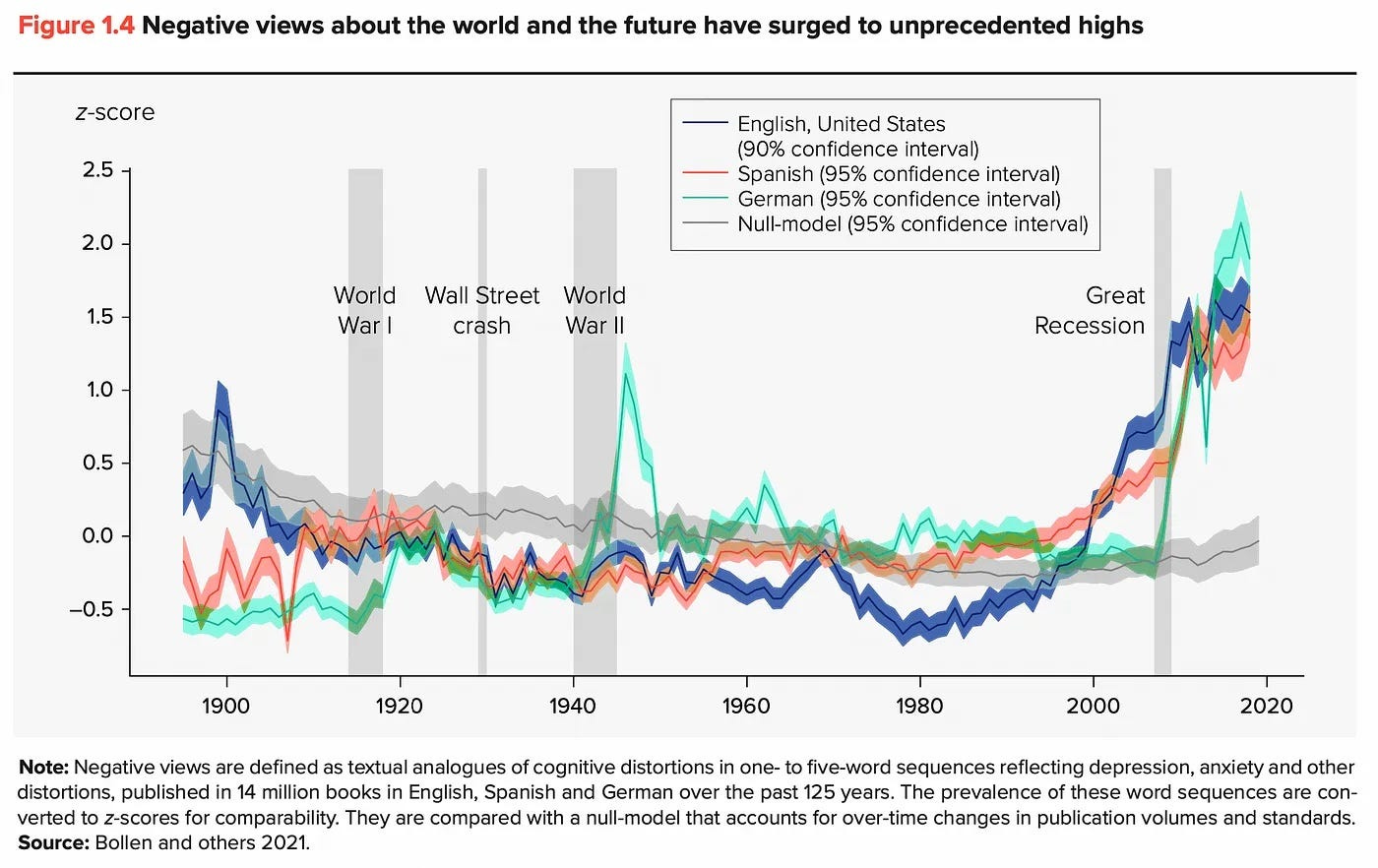 And that’s hardly the end of it. People around the world are more pessimistic than in a century. Sure, that’s very macro-level research, and it comes with caveats, and so on. But the results while they may be off by a few percent here and there — the trend is very, very clear.