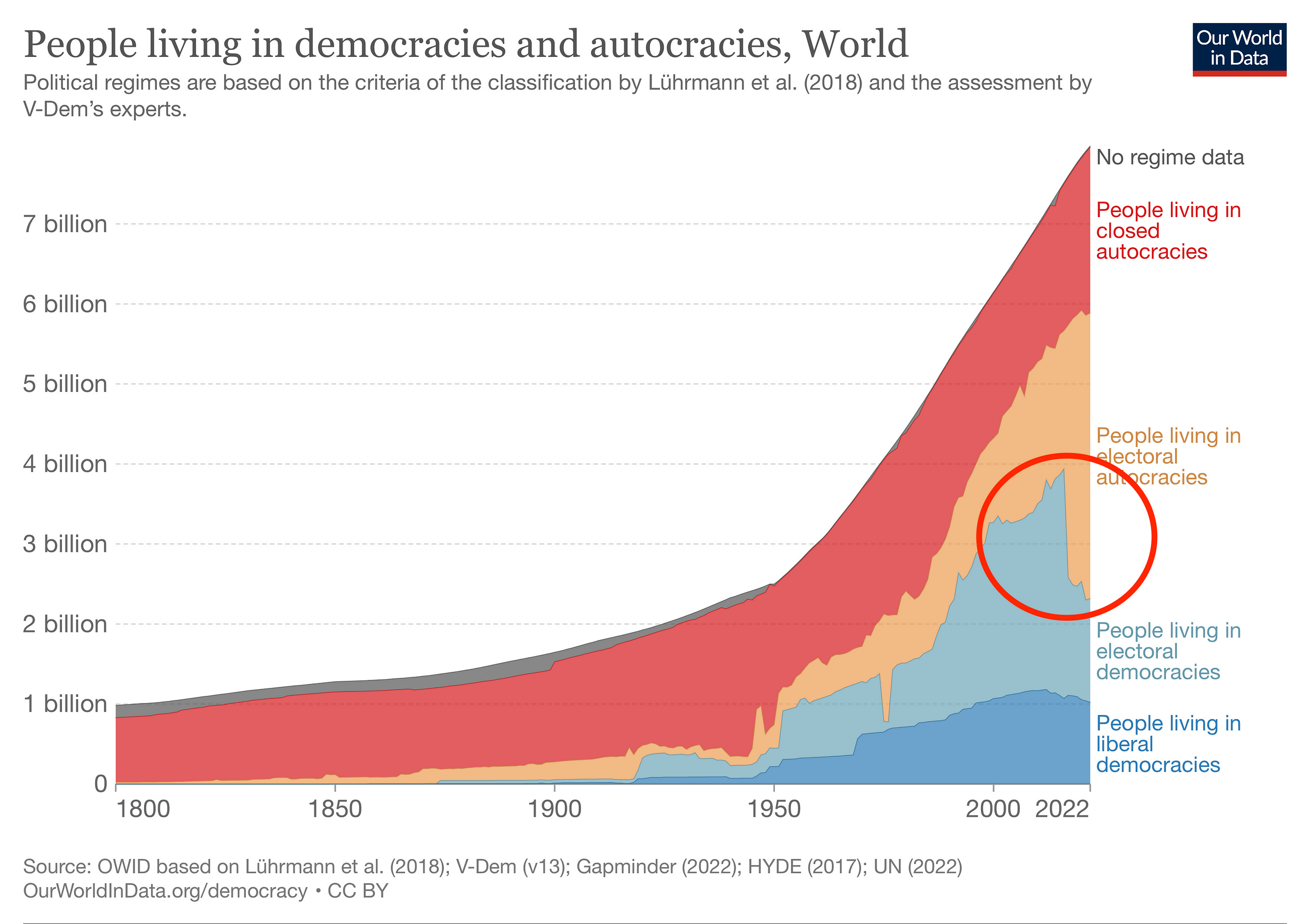 The majority of the world has never even come close to living in a democracy. We in the West have a skewed view of how far and wide democracy really spread. The numbers, when you look at them, the facts, are alarming and startling. Just somewhere between 5 to 10% of humanity has ever lived in a full democracy. That means ones with robust democratic functioning, norms, systems, values. Just 14% of the world lives in full democracy today, and that number only increases to 38% if we include ones that are “flawed” democracies. That means ones where civil rights are still under threat, civic engagement’s low, and there are ongoing problems with basic systems functioning.